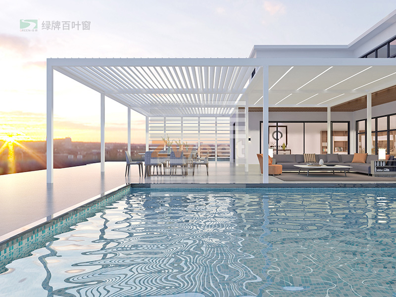 綠牌頂面遮陽(yáng)防雨百葉系統(tǒng)用于露臺(tái)遮陽(yáng),設(shè)計(jì)簡(jiǎn)約,美觀實(shí)用,通過(guò)調(diào)節(jié)頂面的百葉系統(tǒng),起到很好的遮陽(yáng)防雨效果。