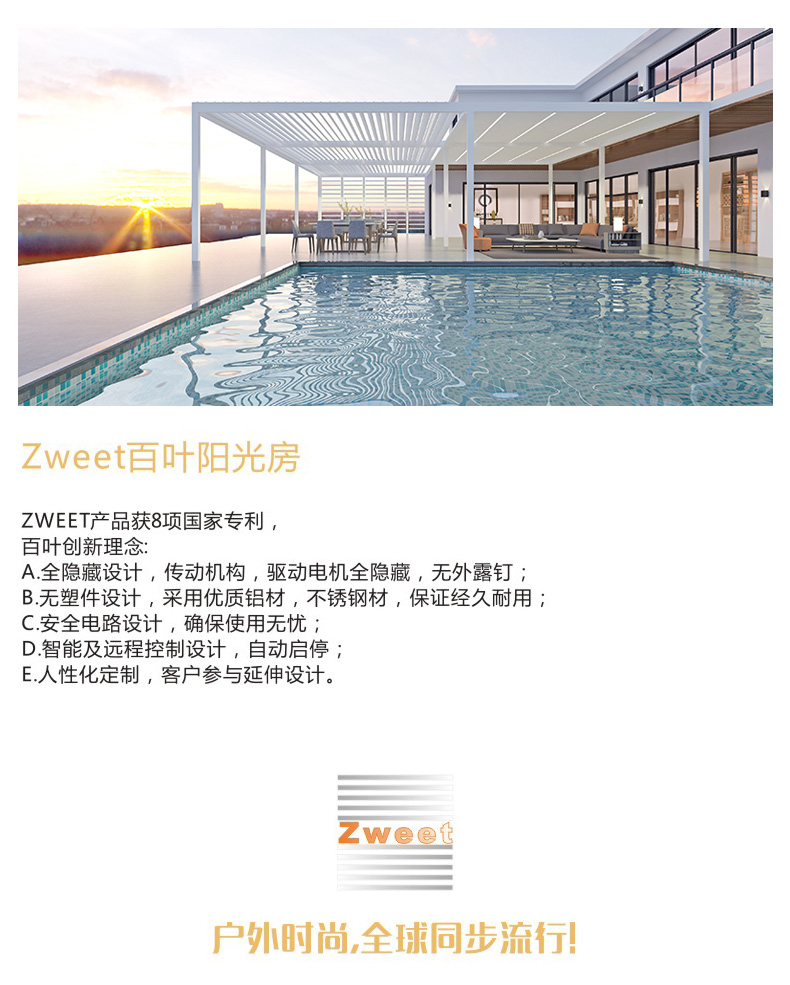 8.陽(yáng)光房的四周可選擇安裝玻璃百葉窗,木制百葉窗,鋁合金百葉窗,玻璃滑動(dòng)門(mén)及垂直的玻纖遮陽(yáng)卷簾,完善您的百葉房功能。