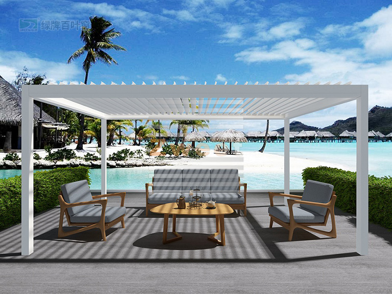 綠牌頂面遮陽(yáng)防雨百葉系統(tǒng)用于露臺(tái)遮陽(yáng),設(shè)計(jì)簡(jiǎn)約,美觀實(shí)用,通過(guò)調(diào)節(jié)頂面的百葉系統(tǒng),起到很好的遮陽(yáng)防雨效果。